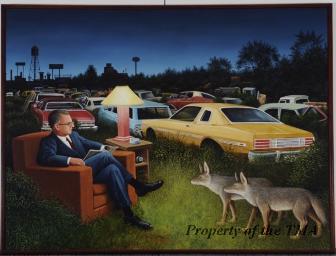 Bill (William) Montgomery, Living Room with Coyotes, 1988, oil painting on canvas, 36 inches X 48 inches, Tyler Museum of Art, Tyler, Texas.