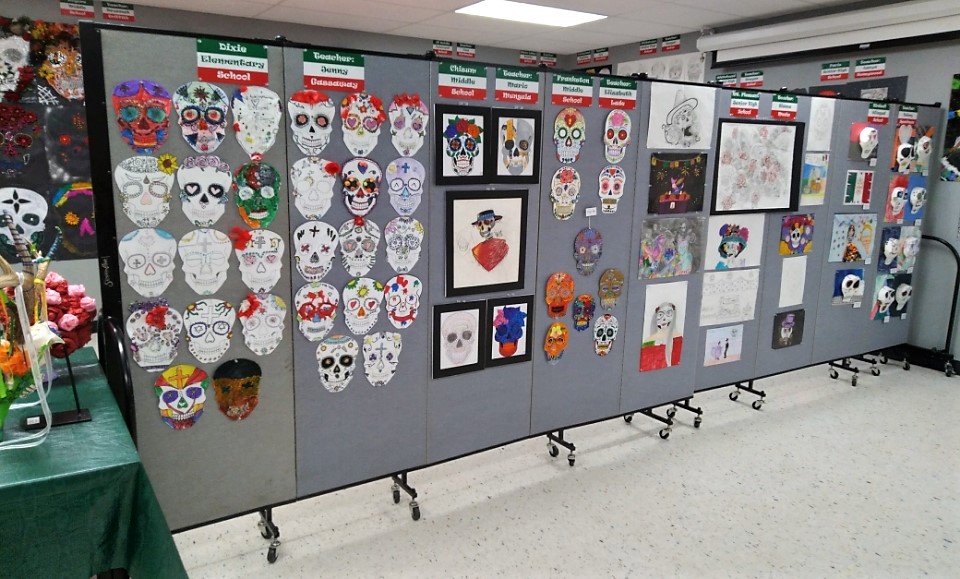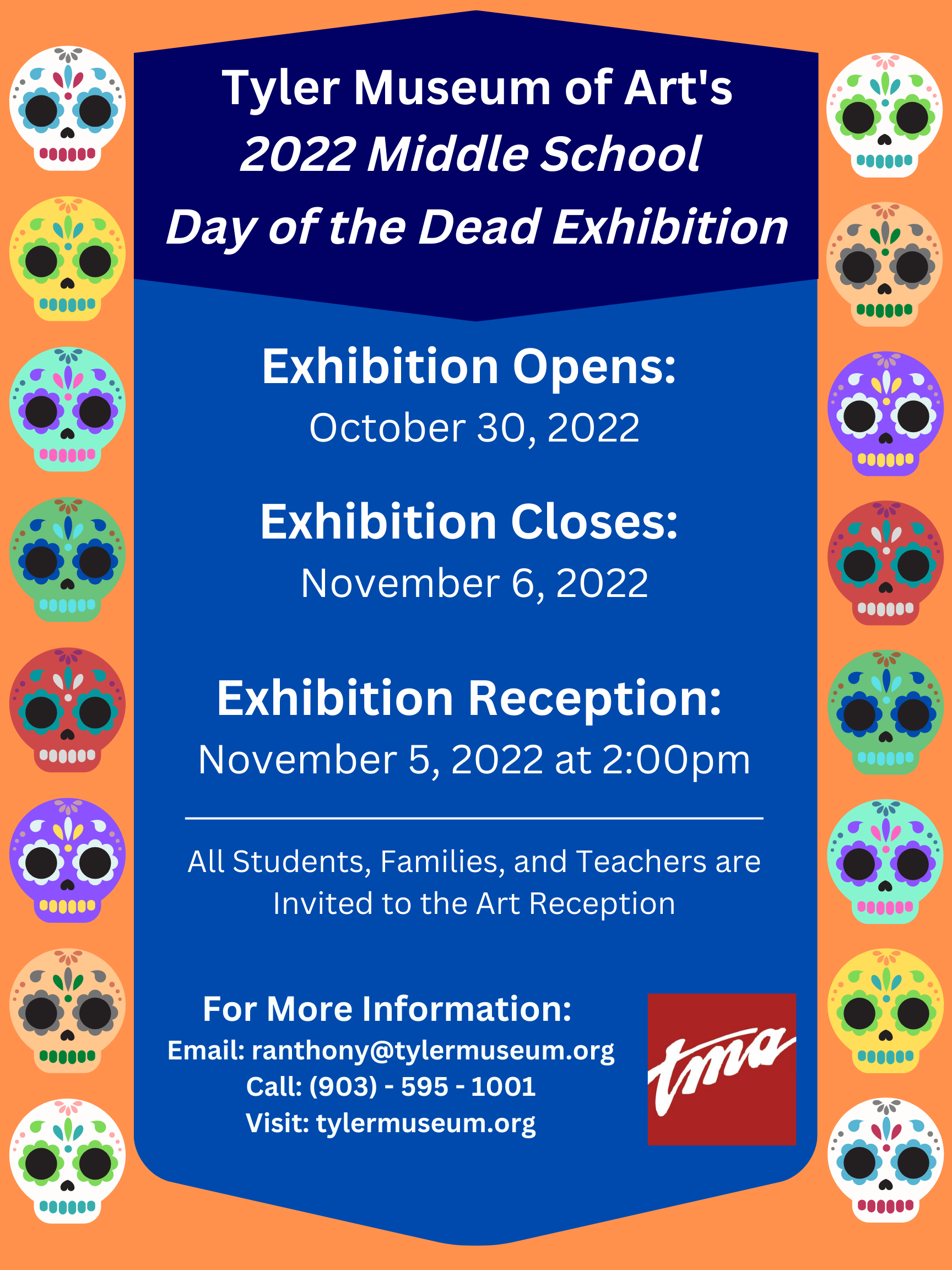 Every year, the Tyler Museum of Art holds a student exhibition for 5th through 8th grade middle school students in the East Texas area. The goal of the exhibition is for middle school students to learn about the cultural festivities of Día de los Muertos. Then, the students create artworks that exhibits the cultural iconography of the holiday. When the artworks are completed, the teachers will select the pieces that will be exhibited in the education gallery.