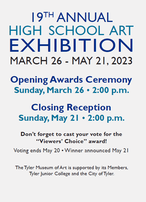 The High School Exhibition presents 96 artworks from East Texas high school art students. The goal is to celebrate art education in the East Texas community. The exhibition is generously sponsored by Betsy Ellis through the Ellis Family Foundation.