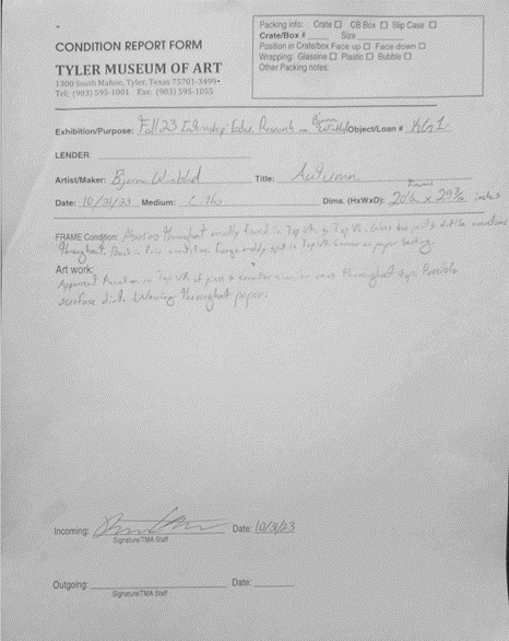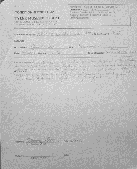Gibson, Kevin. “Condition Report Form: Fall 2023 Internship Education Research on Bjorn Wiinblad.” Condition Report Form, Tyler Museum of Art, 2023.