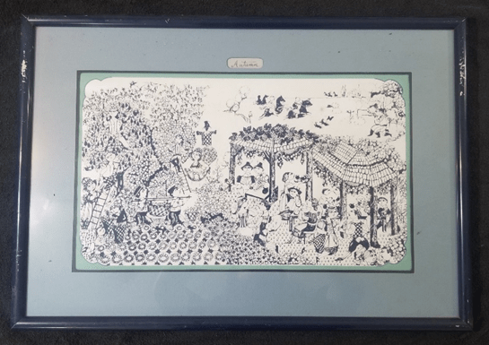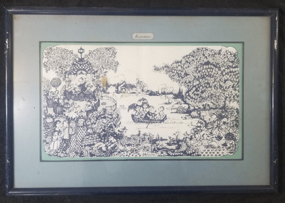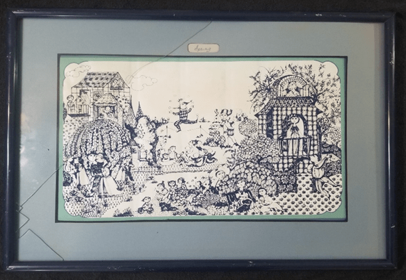 Understanding Bjorn Wiinblad’s history provides important context to possible conservation methods. There are four lithographs to be examined through a conservation lens. Each composition represents an archaic visualization of Dutch culture within a season of the year, as portrayed in Bjorn Wiinblad’s commonly used whimsical style. This style is accentuated by his pencil-like strokes of the litho-crayon that was used to apply his compositions to the block before printing. Common iconography associated with each season can be found within each composition: harvest and hunting for Autumn (Fig. 4), ice skating and sledding in Winter (Fig. 5), flowering landscape filled with love and street performing in Spring (Fig. 6), and paddled boat rides for the Summer (Fig. 7) While the landscapes and buildings change, all the compositions revolve around a lake or field somewhere in composition. This observation gives us a sense of greater depth in composition from Wiinblad when he made these pieces.